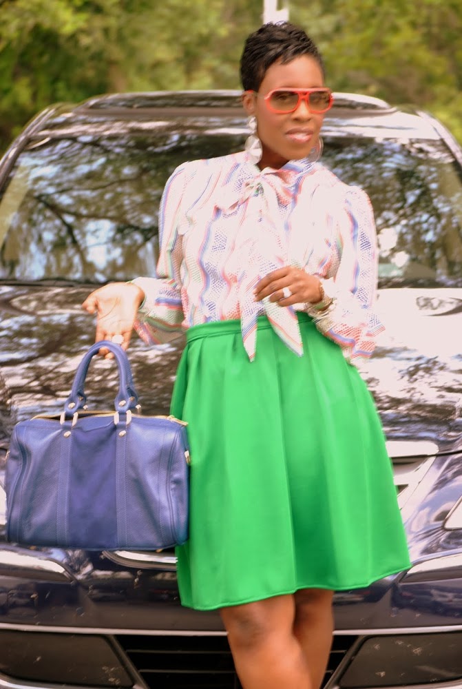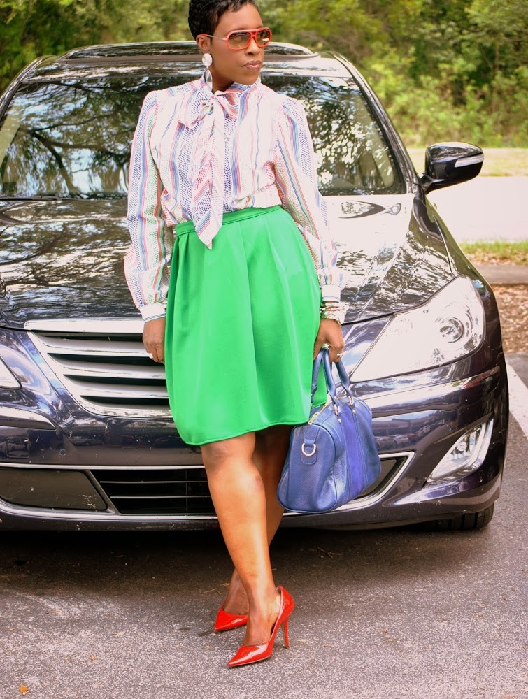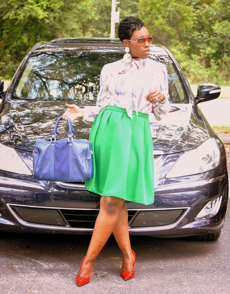 I hope you guys are as excited for the weekend as I am. This is my official OOTD post on my blog so take it easy on me ok? LOL. I’ve always been asked to post my looks of the day on the blog but really never had the courage. So, by popular demand….here we go. Today I’m rocking a DIY skirt that I made a few months back. It wasn’t made with a pattern. The top I thrifted and was so happy when I stumbled upon it. I am an avid lover for vintage mod fashion so be prepared to see lots of a-line skirts, pussy bows, midi skirts and all things vintage inspired in my looks.